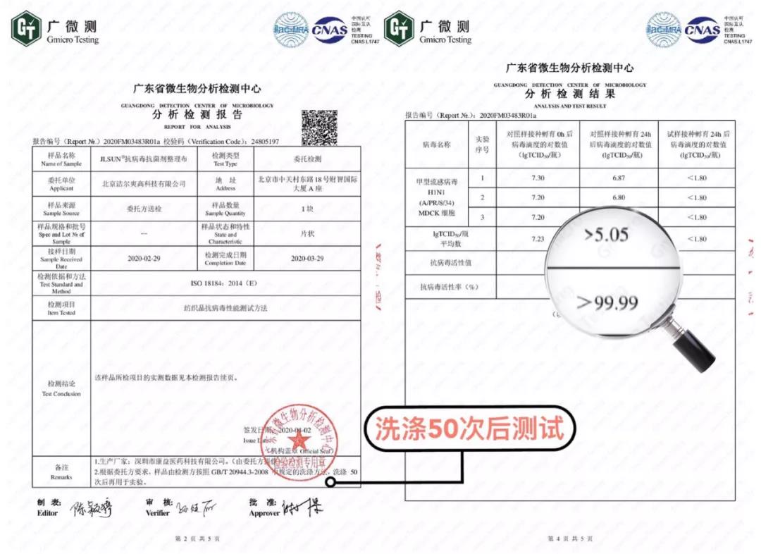 權威第三方檢測機構采用國際標準ISO 18184:2014(E)《抗病毒紡織品的測定》測試,潔爾爽®️抗病毒抗菌劑整理織物對H1N1、H3N2等病毒的抗病毒活性率大于99.9%!并且第三方檢測機構按照GBT 20944.3-2008 標準洗滌50次后,JLSUN®️抗病毒抗菌劑整理布對H1N1甲型流感病毒的抗病毒活性率仍大于99.9%,對肺炎克雷伯氏菌、大腸桿菌、金黃色葡萄球菌、白色念珠菌的抑菌率高達99%。到目前為止,全球沒有任何一個機構報道其抗病毒紡織品能達到如此耐久高效的抗病毒抗菌效果。潔爾爽®️人又一次站到全球功能紡織品研究領域的最前沿!