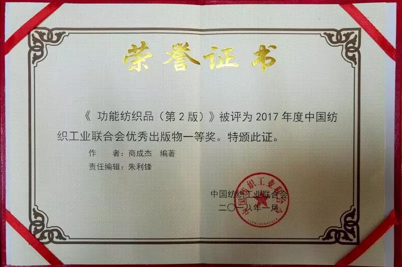 《功能紡織品(第2版)》被評為2017年度中國紡織工業(yè)聯(lián)合會(huì)優(yōu)秀出版物一等獎(jiǎng)!