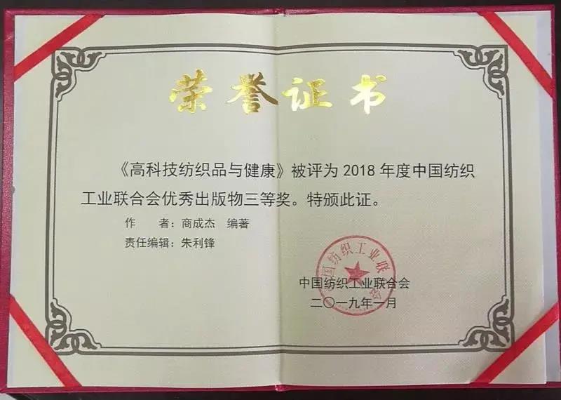 《高科技紡織品與健康》被評(píng)為2018年度中國(guó)紡織工業(yè)聯(lián)合會(huì)優(yōu)秀出版物三等獎(jiǎng)!這是繼《功能紡織品(第2版)》被評(píng)為2017年度中國(guó)紡織工業(yè)聯(lián)合會(huì)優(yōu)秀出版物一等獎(jiǎng)之后,商成杰教授的又一學(xué)術(shù)著作榮獲優(yōu)秀圖書大獎(jiǎng)!