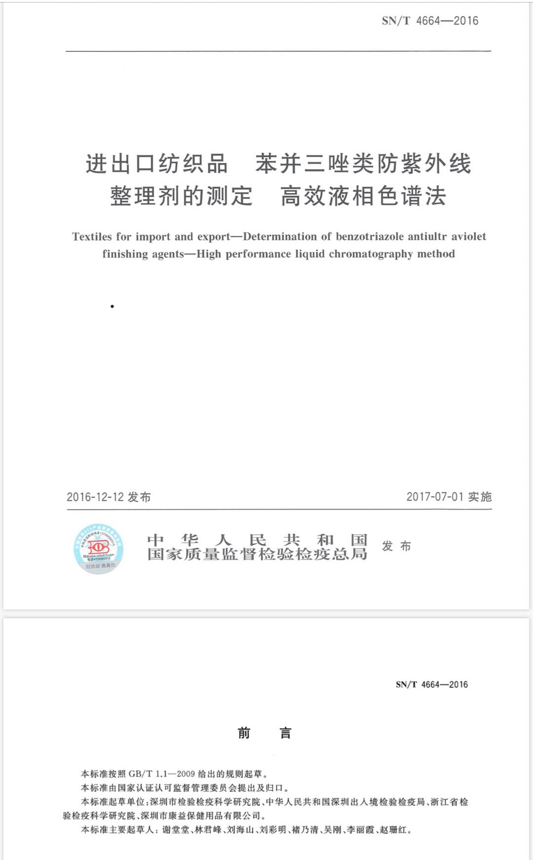 國(guó)家出入境檢驗(yàn)檢疫行業(yè)標(biāo)準(zhǔn)《SN/T 4664-2016進(jìn)出口紡織品 苯并三唑類(lèi)防紫外線(xiàn)整理劑的測(cè)定高效液相色譜法》發(fā)布